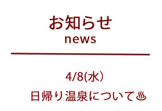 平素より当館をご利用いただき、誠にありがとうございます。 現在、燃料供給が一時的に不安定な状況のため、 露天風呂、内湯①、家族風呂につきましては、当面の間ご利用を休止させていただきます。 また、温泉のご利用時間につきま...